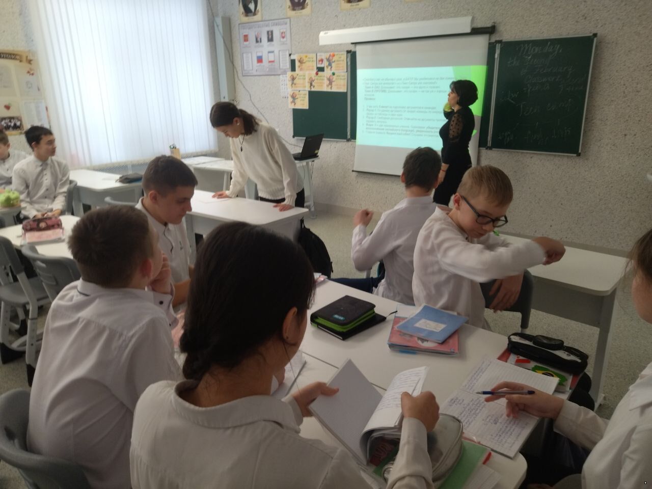 состоялся открытый урок по английскому языку в 7 классе на тему: «Кто есть кто?» в рамках недели предметов филологического цикла. Учитель английского языка Решидова Э.Н. использовала ИКТ для объяснения внешности человека, видео-материалы с преобразованием внешности человека. Ребята с помощью различных активных форм работы: работа с карточками, задания на соответствие, рисунок внешности по описанию изучали новую тему. На уроке была выполнена работа по аудированию, работа по изучению новых слов. Урок проведен на высоком методическом уровне, ребята остались довольными своими достижениями. Молодцы!