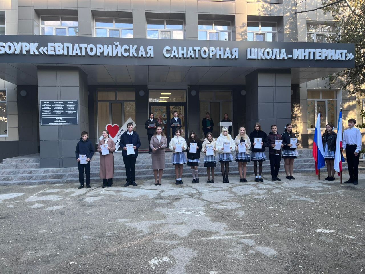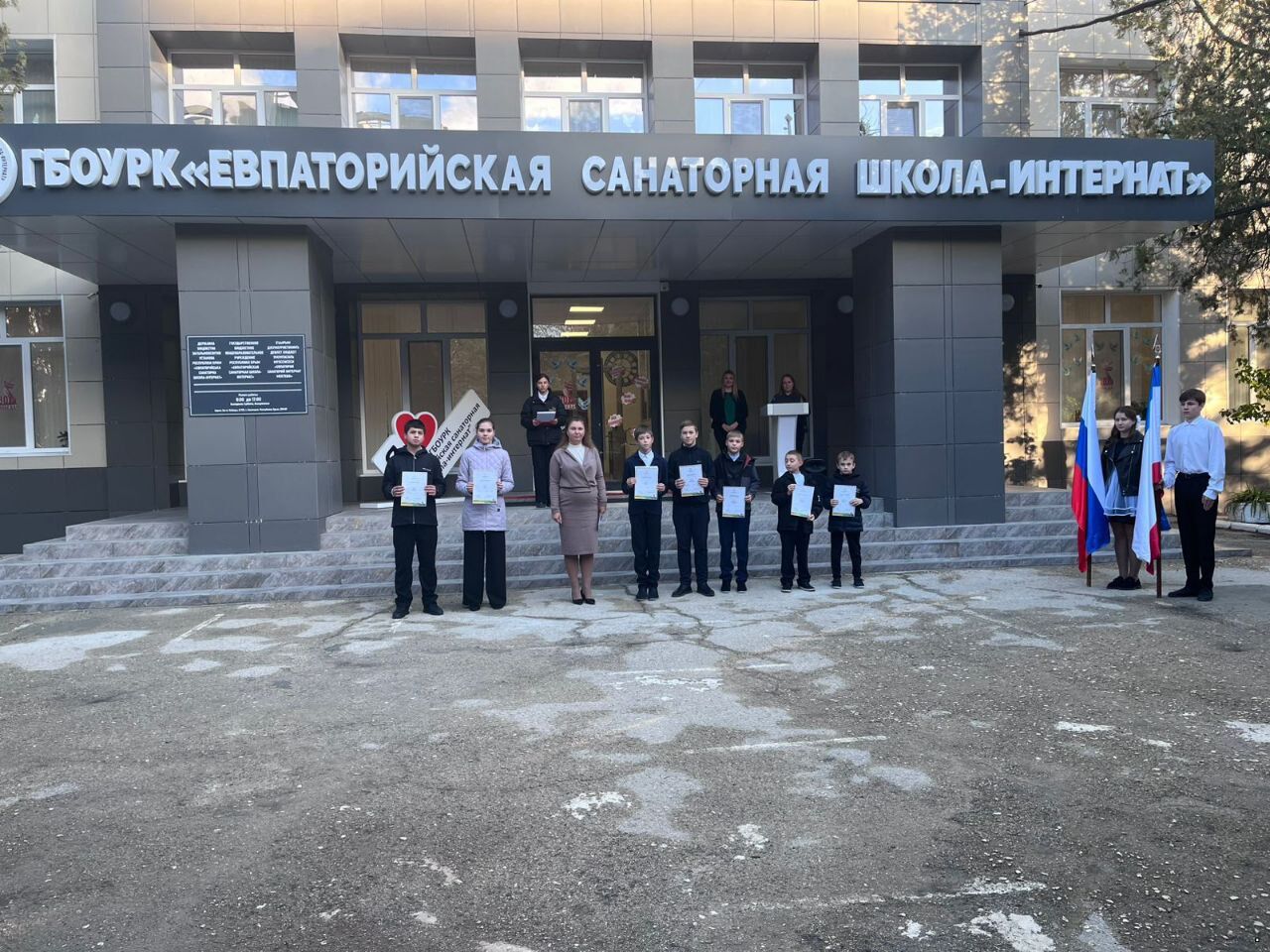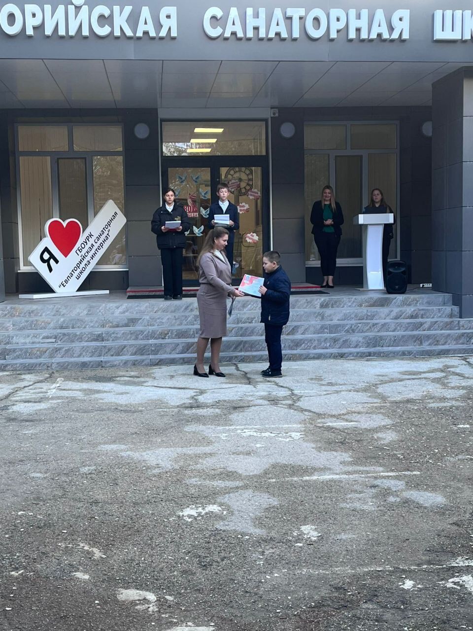 20 октября 2025 г. последняя неделя первой четверти неделя в нашей школе-интернате началась с традиционной линейки, посвященной выносу флагов Российской Федерации и Республики Крым и исполнению гимнов. Право внести флаг предоставлено обучающимся 9 класса Капишену Кириллу и Юрьевой Виктории. На линейке директор школы Анна Юрьевна Абдувелиева вручила сертификаты за участие во Всероссийской электронной олимпиаде по пожарной безопасности также обучающемуся 3 класса Пашуку Валерию. Также Анна Юрьевна вручила сертификаты обучающимся 8 и 9 классов за активное участие в неделе социально-гуманитарного и художественно-эстетического цикла, которая проходила в нашей школе-интернате с 13 по 17 октября. Анна Юрьевна наградила участников аграрного диктанта, ими стали обучающиеся 6, 7, 4 и 2 классов.