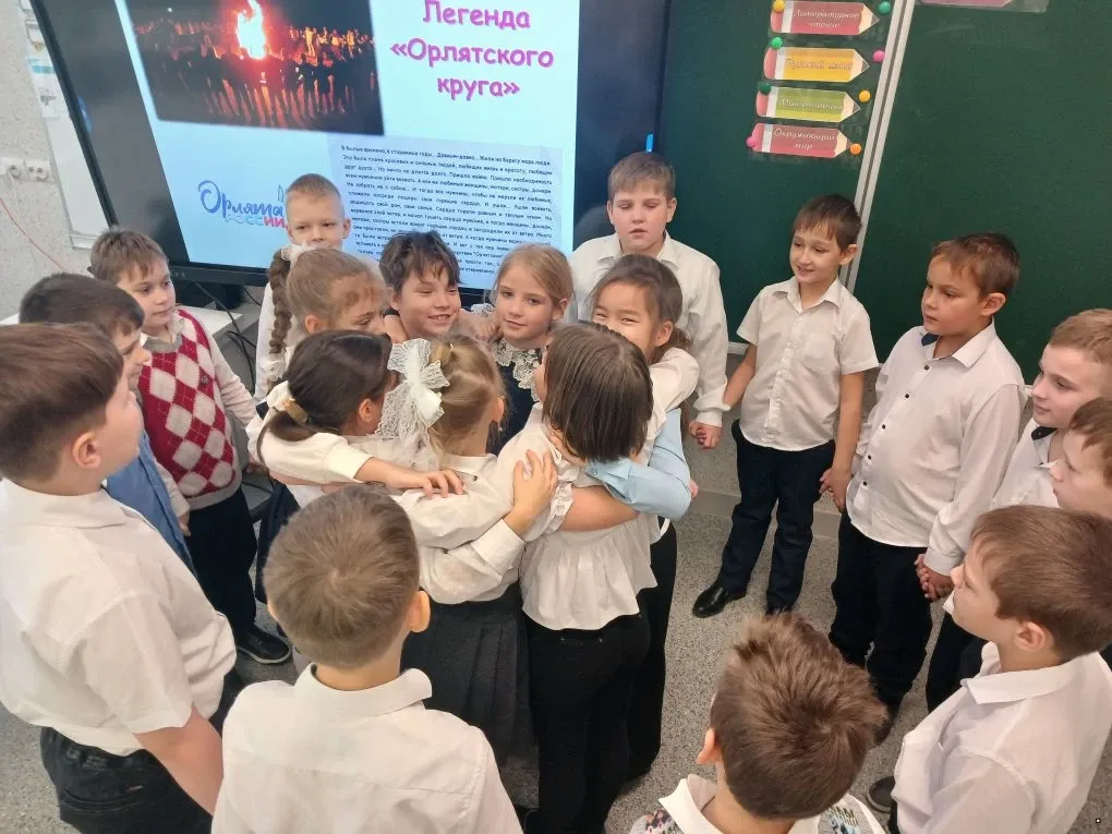 Затем Орлята познакомились с символом трека – "Кругом Добра". Этот символ олицетворяет единство и сплочённость, когда каждый человек протягивает руку помощи другому. Дети обвели свои ладони и нарисовали внутри них добрые сердца. Все ладошки соединили в общий "Круг Добра", символизируя свою готовность совершать добрые дела.
