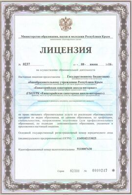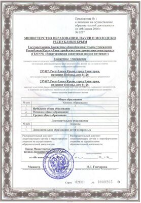 | Наименовании образовательной программы | Основная образовательная программа начального общего образования (1-4 классы) ГБОУРК "Евпаторийская санаторная школа-интернат" срок реализации 4 года | Основная образовательная программа основного общего образования (5-9 классы) ГБОУРК "Евпаторийская санаторная школа-интернат" срок реализации 5 лет | Основная образовательная программа среднего общего образования (10 - 11 классы) ГБОУРК «Евпаторийская санаторная школа-интернат» срок реализации 2 года | Дополнительная общеобразовательная общеразвивающая программа ГБОУРК "Евпаторийская санаторная школа-интернат" |
