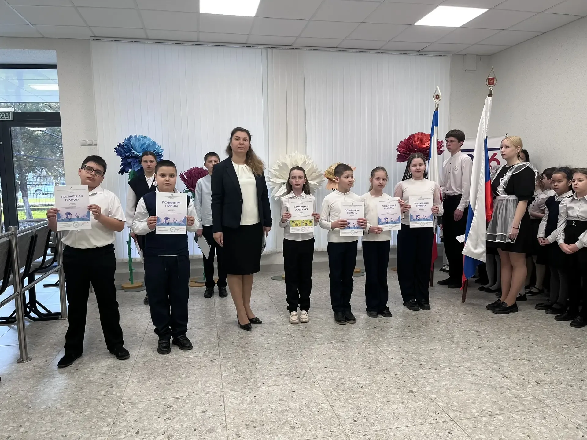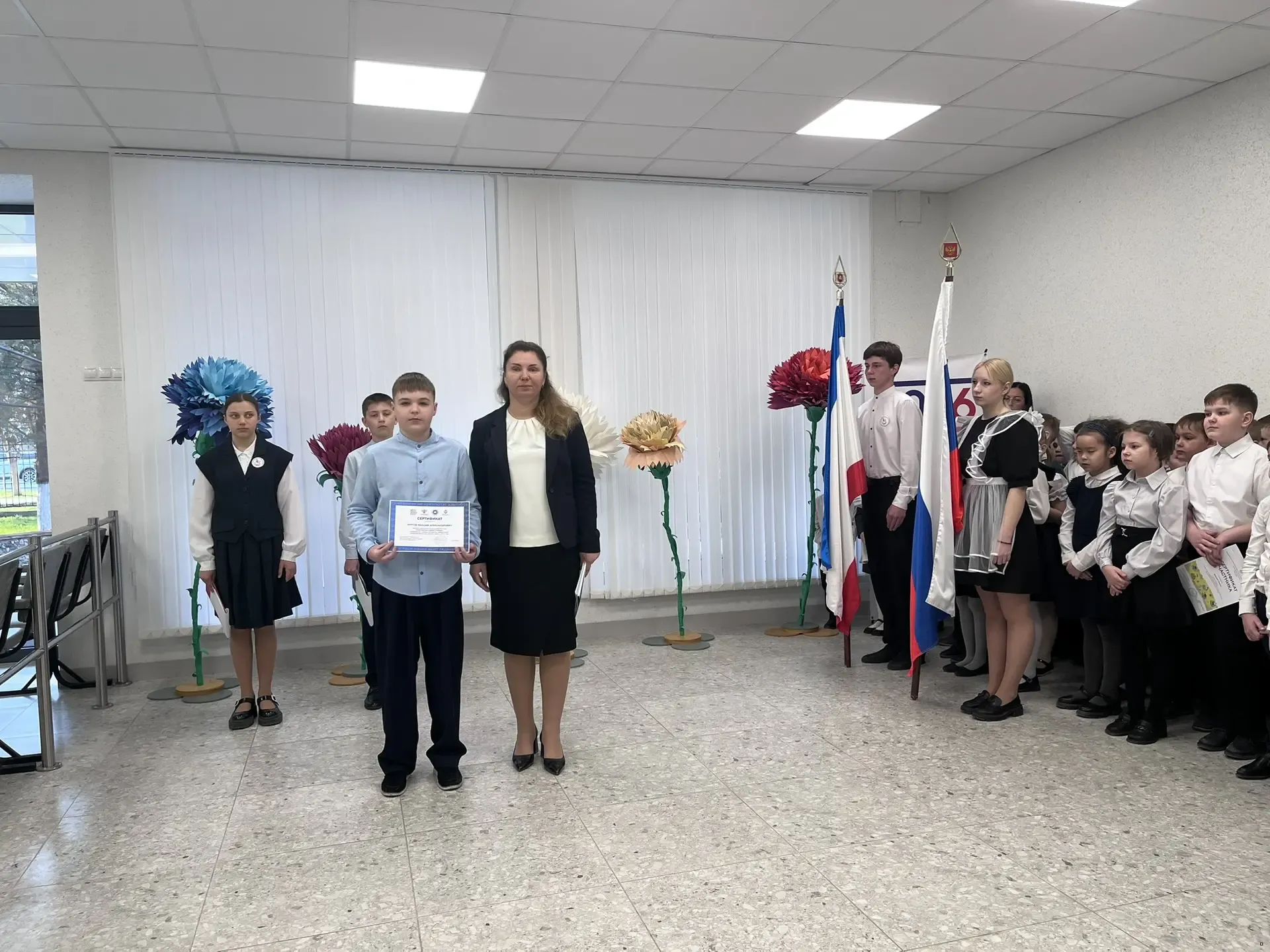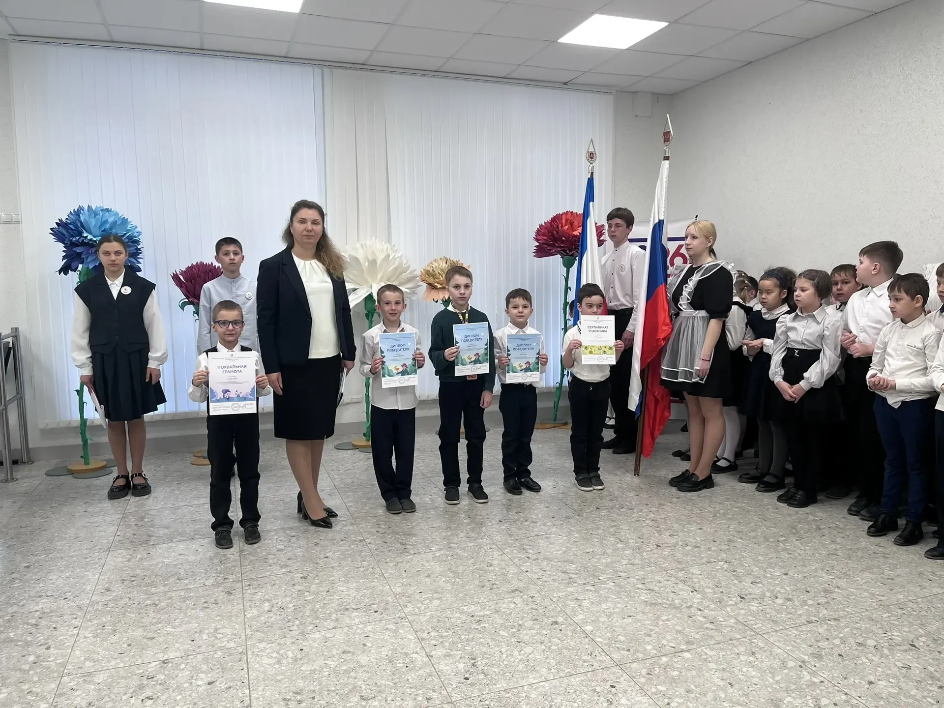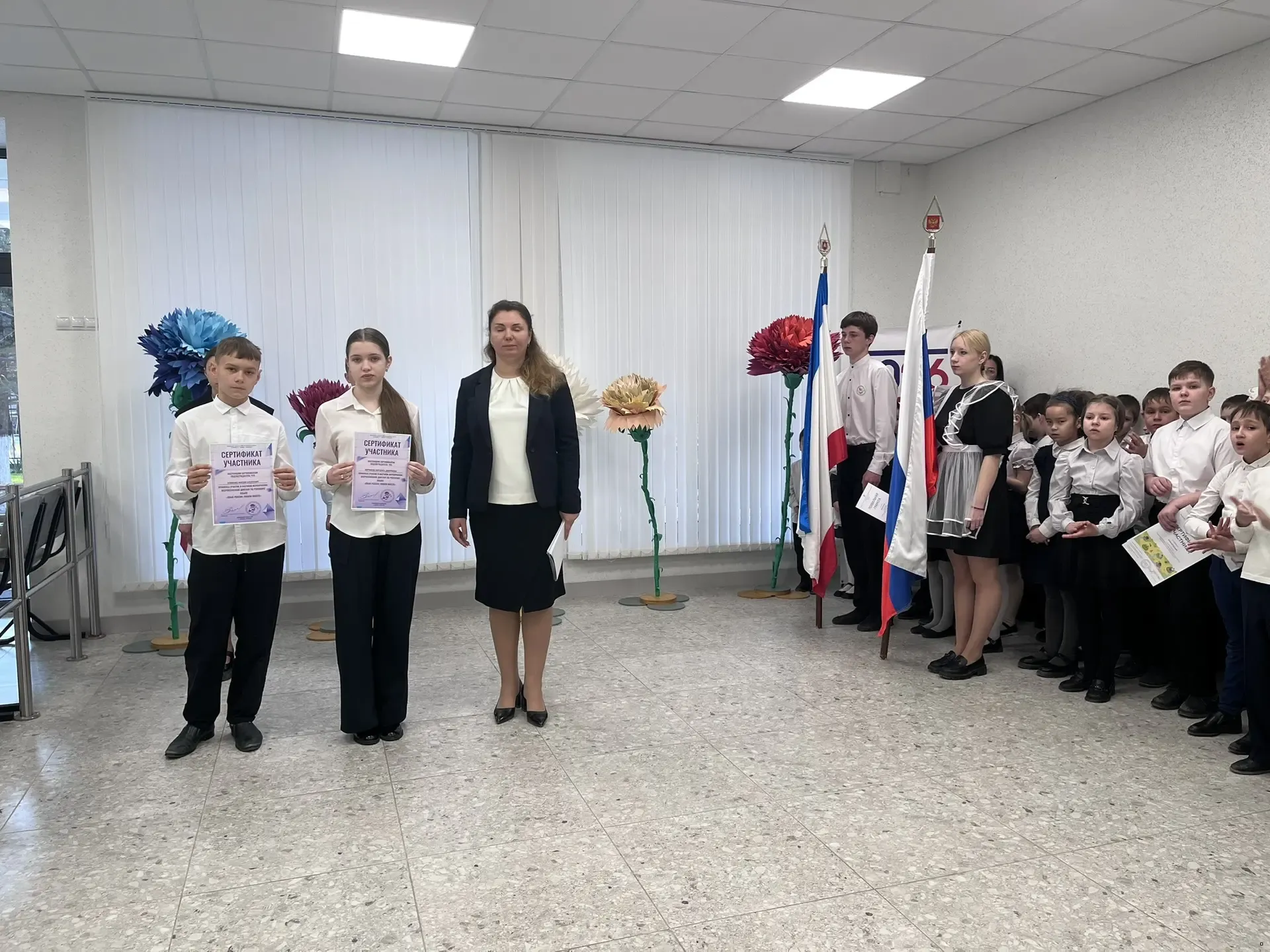Утро понедельника 23 марта 2026 года в школе традиционно началось с торжественной линейки, церемонии выноса флагов и исполнения гимнов Российской Федерации и Республики Крым. Почетное право внести флаг предоставлено обучающимся 9 класса Капишену Кириллу и Коротковой Наталье. На линейке директор школы Анна Юрьевна Абдувелиева вручила обучающимся начальной школы Сертификаты участников, Дипломы победителей и Похвальные грамоты за участие во Всероссийской онлайн-олимпиаде Учи.ру по окружающему миру. Сертификат участника Всероссийской акции "МОЙ УЧИТЕЛЬ РОДНОГО ЯЗЫКА" в рамках программы празднования Международного дня родного языка в 2026 году получил обучающийся 7 класса Крутов Максим.
